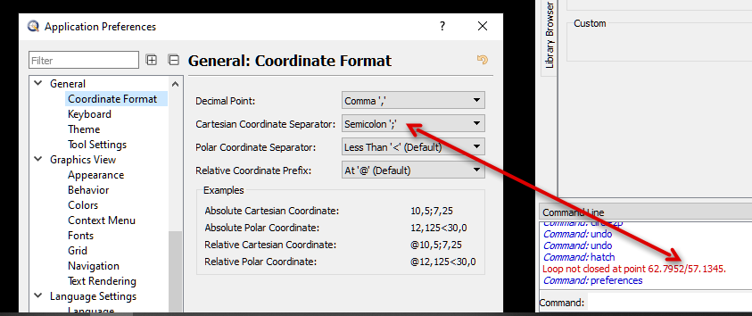 Additional remark: If I use e.g. a tool like the hatch tool and it finds "Loop not closed at point 123.818/260.631" I can't use this information unedited to find the location. I've to copy and change it to my used coordinate separator settings. In my case from slash to comma what is in my opinion an unnecessary and confusing (and error-prone) extra step.