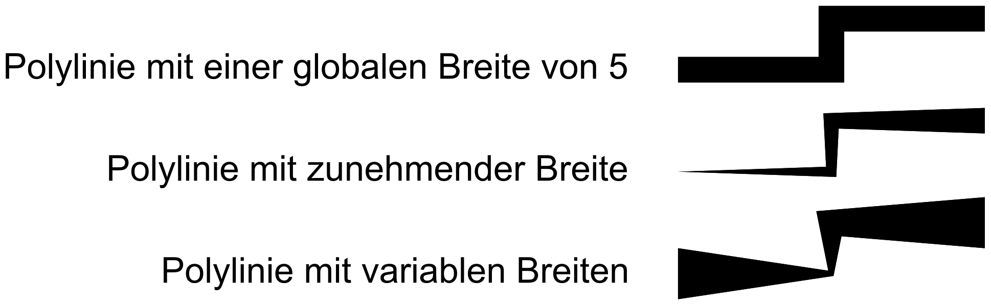 Alternativ können Sie dem Anfang oder Ende eines einzelnen Segments der Polylinie benutzerdefinierte Linienbreiten zuweisen (Eigenschaften Anfangsbreite und Endbreite). In diesem Beispiel wurde die Startbreite des ersten Segments auf 0,5 und die Endbreite auf 5 eingestellt: