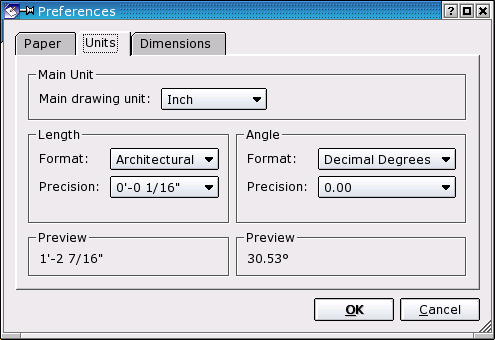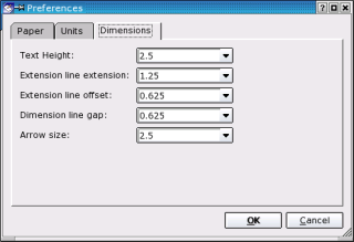 19 Nastavení výkresuToto nastavená se týká pouze aktuálního výkresu. Používá se pro nastavení kreslících jednotek, velikosti papíru, nastavení vlastností kótování, atd ... Úpravy - Nastavení aktuálního výkresu PapírNastavení papíru má vliv pouze při tisku výkresu. Formát papíru a jeho orientace kterou vyberete v tomto dialogovém okně bude použita při náhledu před tiskem (obrázek 68). Figure 68: Nastavení papíru pro aktuální výkres. JednotkyZvolené jednotky a formát délek a úhlů je použit pro souřadnice zobrazené ve stavovém řádku, popisky kót a také pro vkládání dílů z knihovny ve správném měřítku. Detailní přehled dostupných jednotek a formátů viz Dodatek - Kreslící jednotky (obrázek 69). Figure 69: Jednotky a jejich formát. KótyV této záložce můžete změnit rozměry kótovacího textu, velikost šipek a daší rozměry použité pro kóty (obrázek 70). Figure 70: Vlastnosti kót.