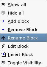 Mit einem Doppel-Klick auf einen Blocknamen in der Blockliste können Sie die den Block (respektive alle Inserts dieses Blockes) sichtbar oder unsichtbar machen. Dies wird häufig auch als einfrieren und auftauen bezeichnet. Das gleiche kann über das Kontextmenü erreicht werden, das mit einem Rechts-Klick auf den Blocknamen angezeigt wird (Abbildung 17).