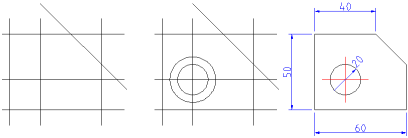 Ábra 2: A blokk három megjelenése eltérő színnel, elforgatással és mérettel. CAD vázlatokA CAD rendszerek sokban hasonlítanak a hagyományos vázlatkészítésre. A tervek, vagy objektumok rajzolása során segédeszközöket használunk, mint a vonalzó. A CAD programokban sokféle segédeszköz található ugyanerre a célra. Nagy előnye a CAD rendszereknek, hogy az elemek megrajzolásuk után is könnyen módosíthatóak. Ez lehet a legnehezebben elsajátítható a hagyományos szerkesztésről való áttérés során. A CAD programokban sok olyan vonalat készítünk, ami nyomtatásban nem jelenik meg, vagy a mérete nem megfelelő és utólag igazítani kell (3 ábra). A kezdők általános hibája, hogy rögtön a kész méreteket és vonalakat akarják létrehozni.