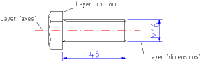 图 1 显示了一个使用了层的例图。所有图样的标尺都设在层“dimensions”上。 所有标尺对象的颜色由这个层设定并且可以简单的改变成适合层“dimensions”的颜色。 此外这个图样可以通过隐藏层“dimensions”来显示无标尺的图样。