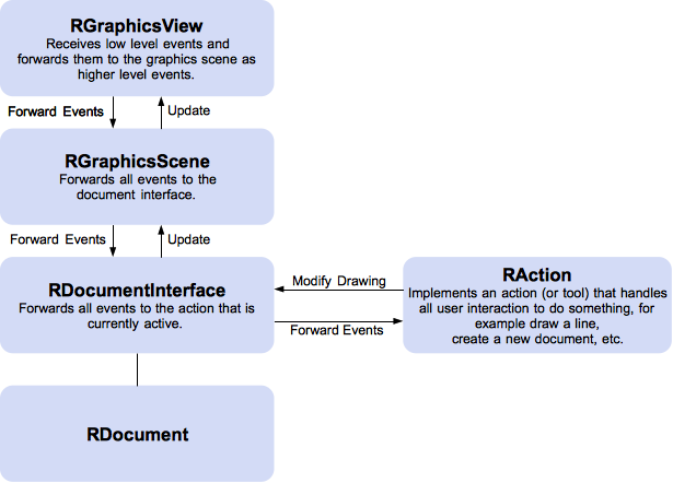 The document interface always knows what action (or tool) is currently active. For example if the user is drawing a line, the current action is a class derived from RAction that handles all user interaction to draw a line (e.g. Line2P). The document interface forwards all events it receives to the current action.