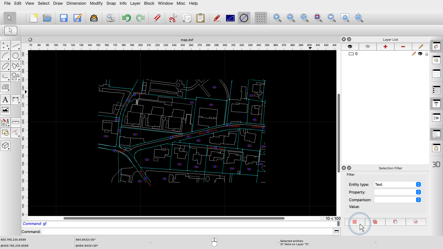 move them to a dedicated layer called "Cadastral Numbers". For this, we need to filter the text entities