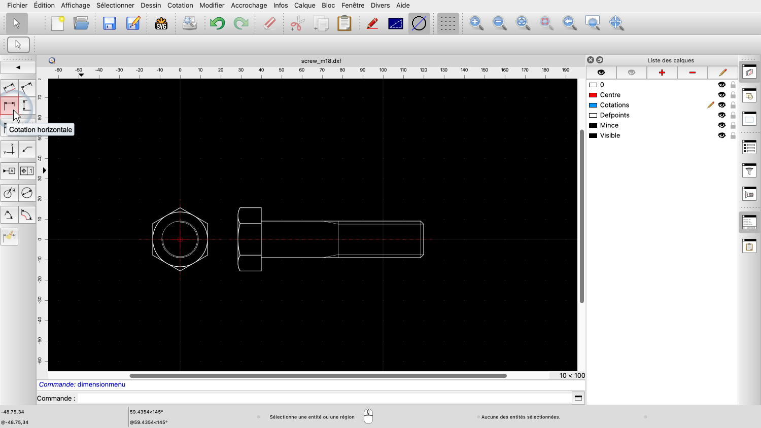 Dans cet exemple, nous pouvons coter la longueur nominale de la vis avec une cotation horizontale.