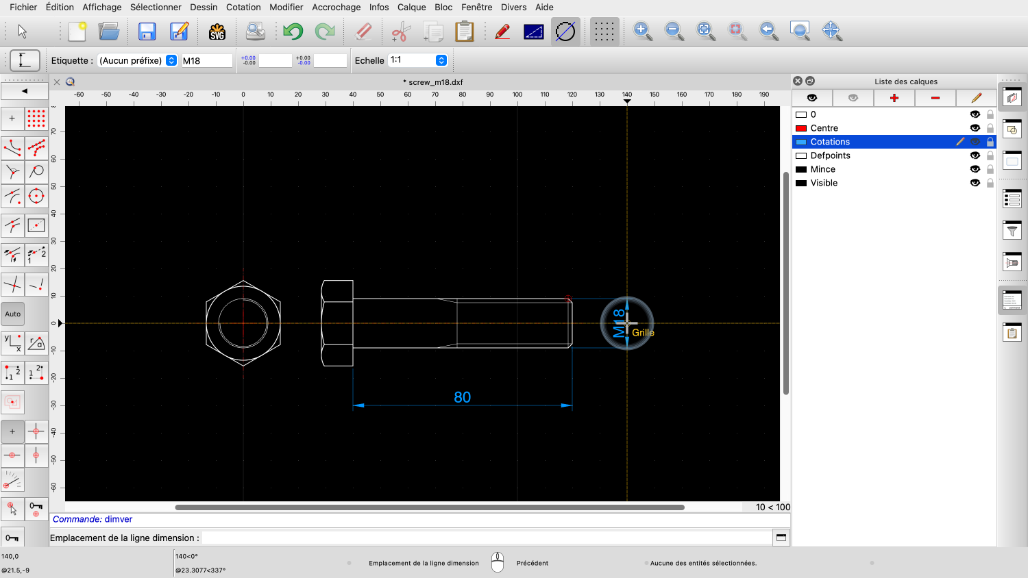 Dans ce dessin, nous voulons déplacer l'étiquette de texte de la cotation de la tête de vis.