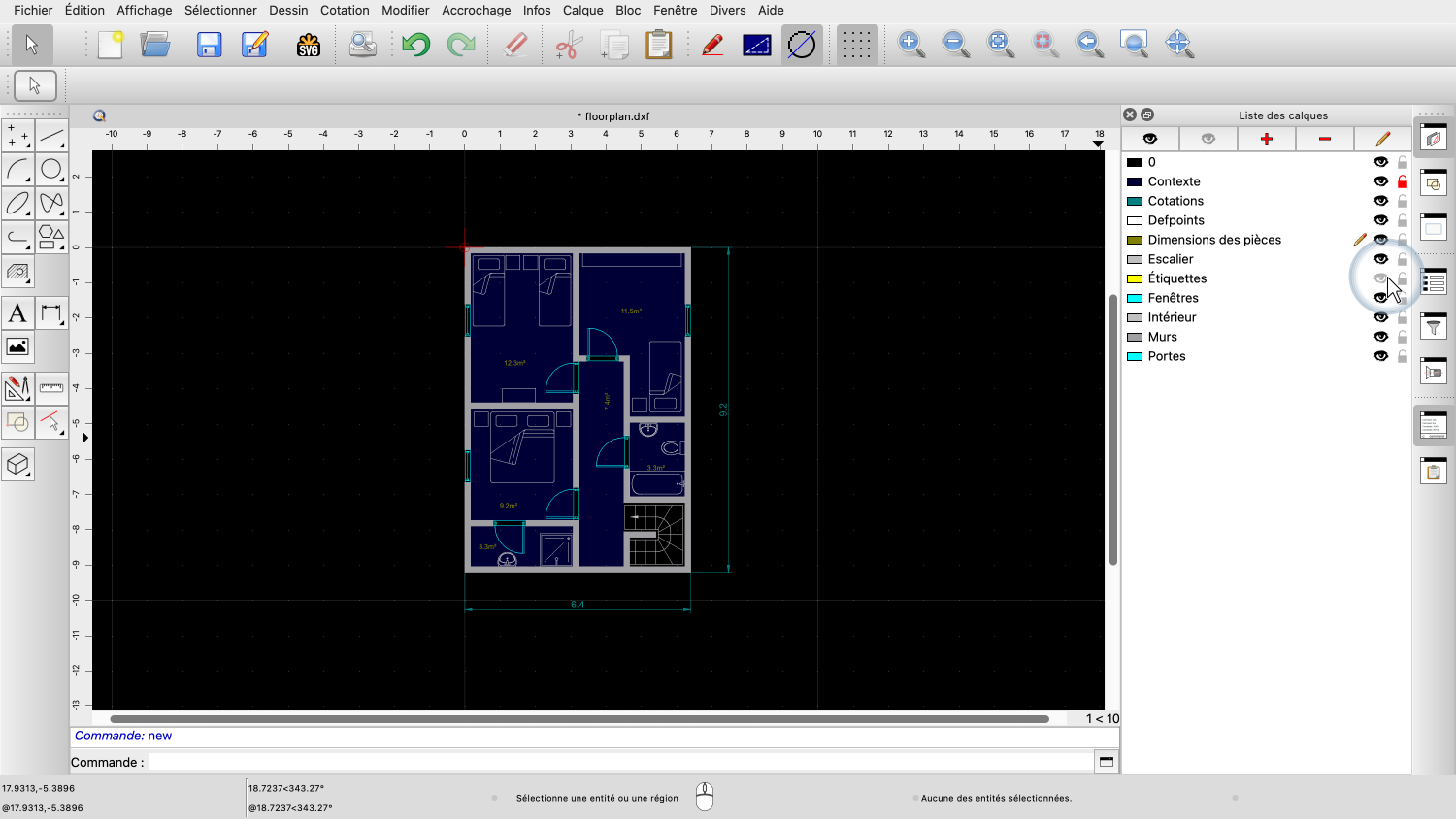 Par exemple, pour supprimer le calque contenant les dimensions des pièces, nous activons d'abord le calque en cliquant sur son nom.