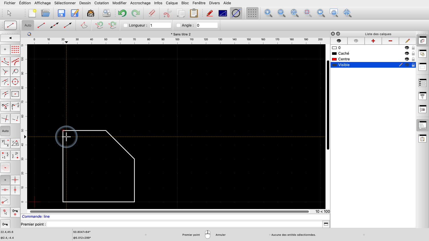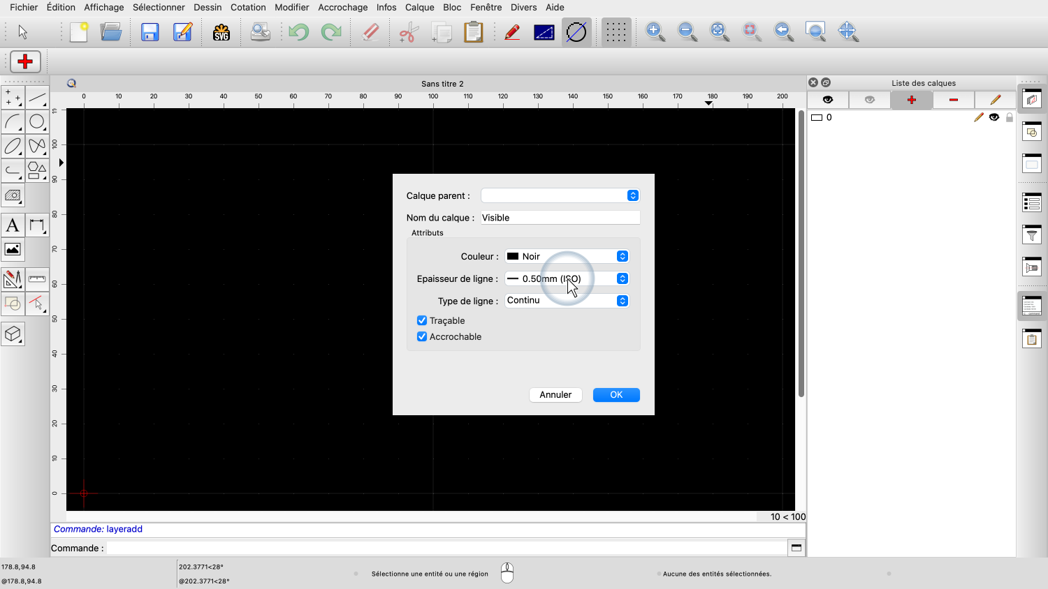 Comme il est généralement recommandé, nous laissons le calque 0 vide et créons nos propres calques pour notre dessin.