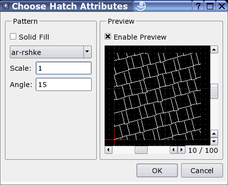 Диалог опций штриховки отображён на Figure 47. Выберите образец штриховки, масштабый фактор и угол поворота. Если вы хотите заполнить объект цветом вместо штриховки, отметьте 'Solid Fill'.