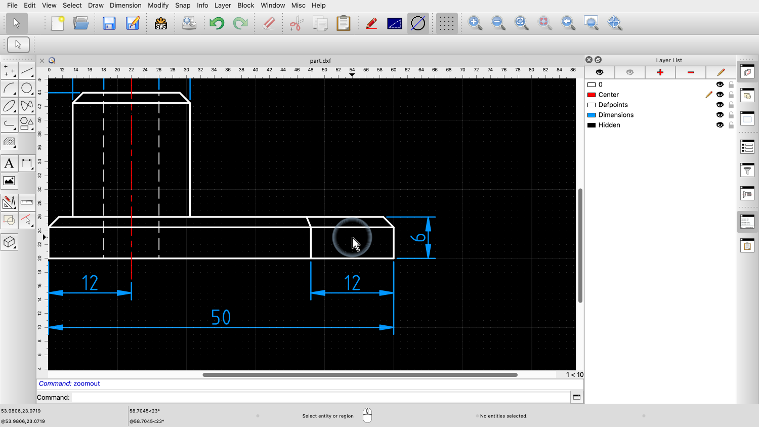 As soon as we let go of the mouse button, QCAD zooms in on the chosen area.
