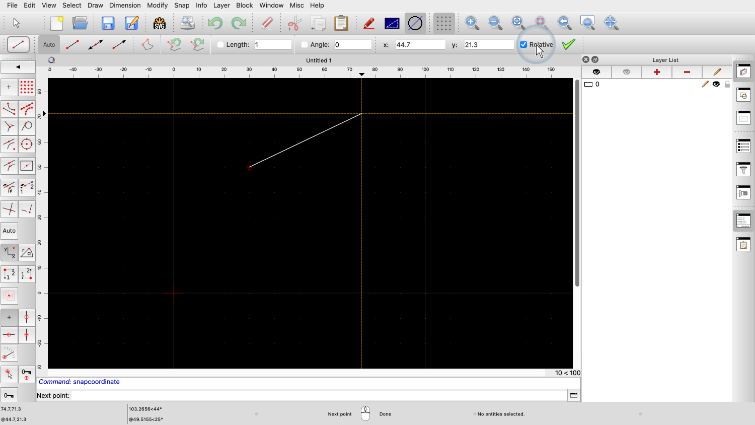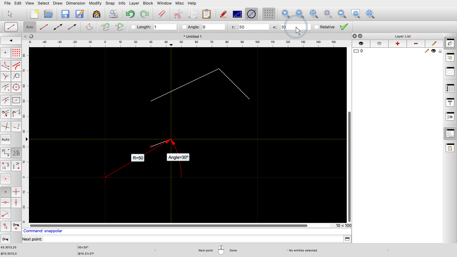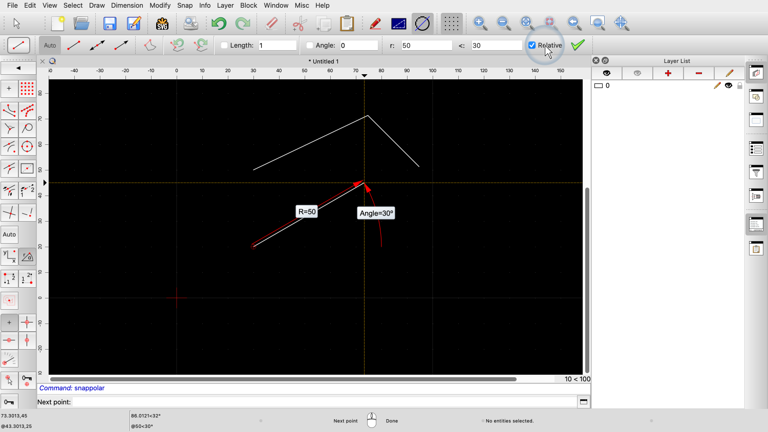 If we also activate relative coordinates, we can draw a line that is 50 units long at an angle of 30 degrees.