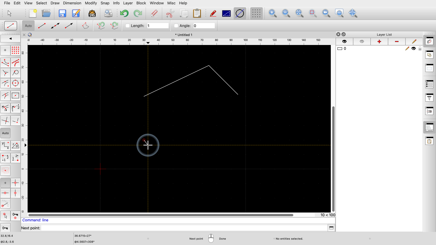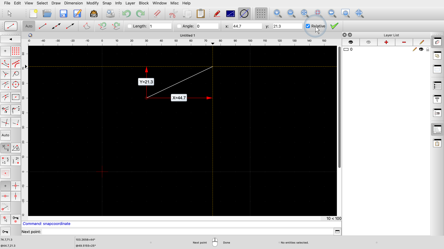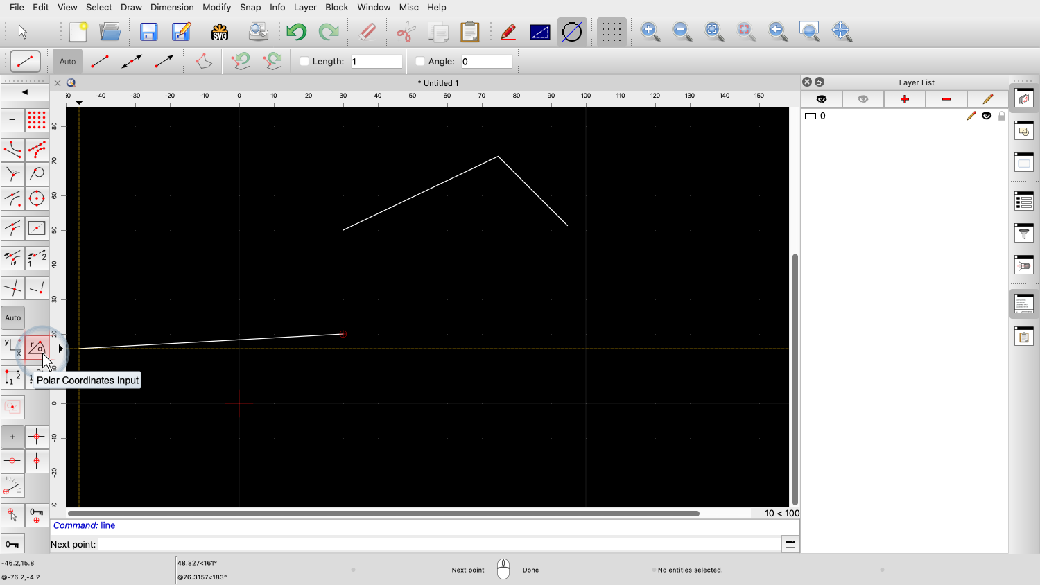 If we also activate relative coordinates, we can draw a line that is 50 units long at an angle of 30 degrees.