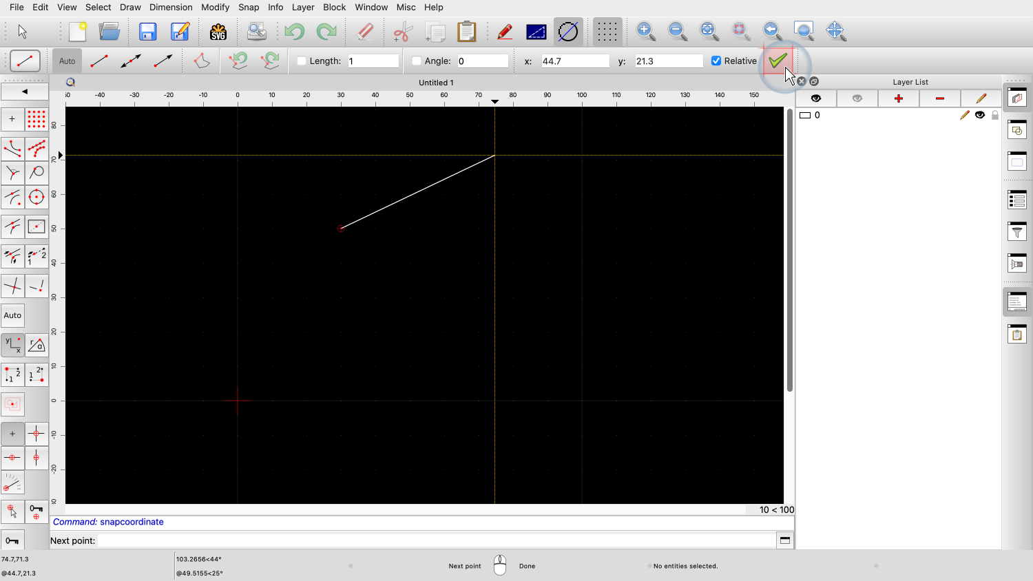 By entering relative coordinates, we can tell QCAD the desired measurements of our line in [X] and [Y] direction.