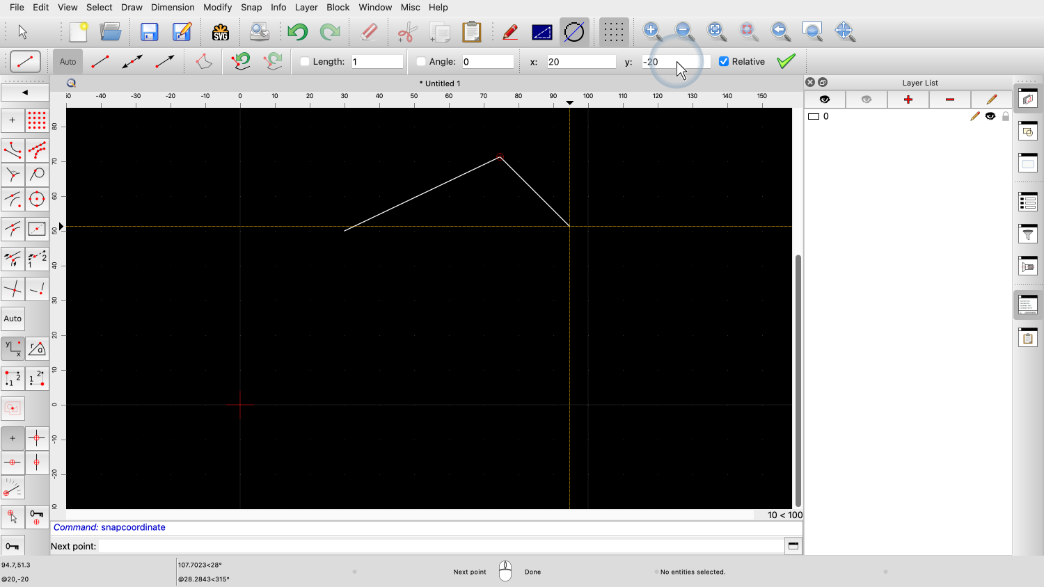 Note how the relative zero point was automatically moved to the end point of the line, so we can enter directly another relative coordinate for the next line segment.