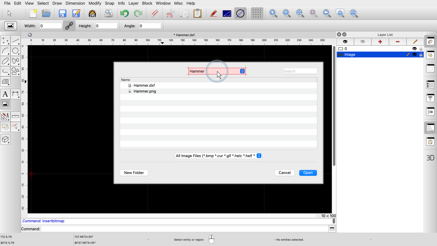 the left to insert an image. QCAD shows the file dialog to let us choose an