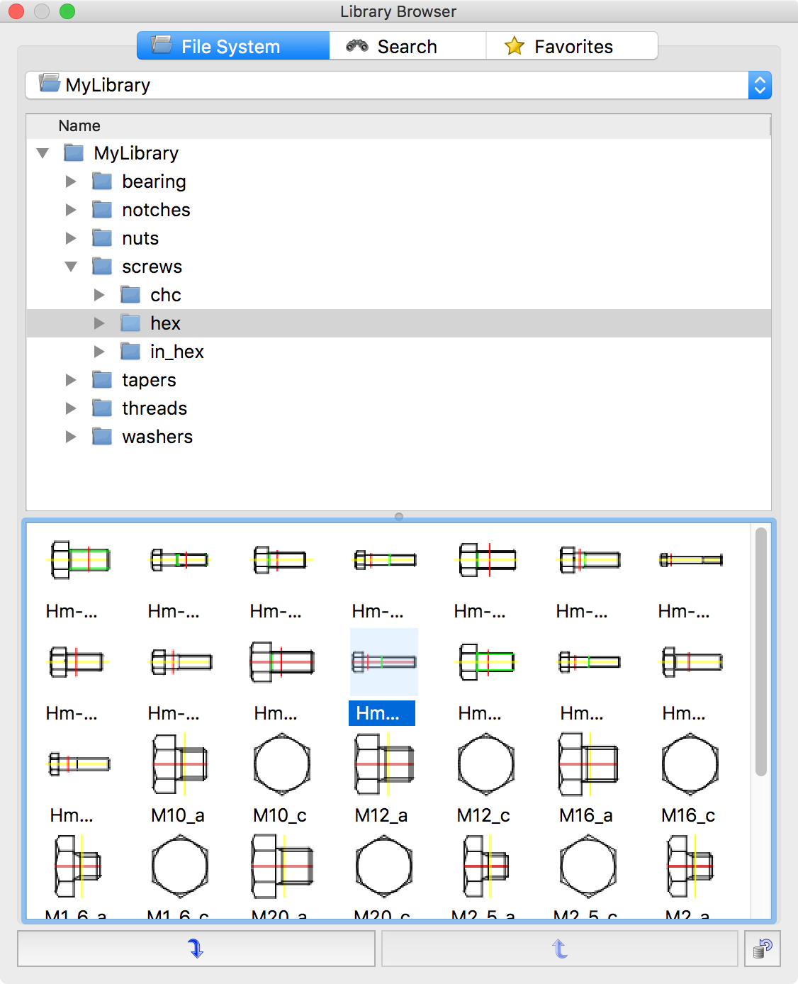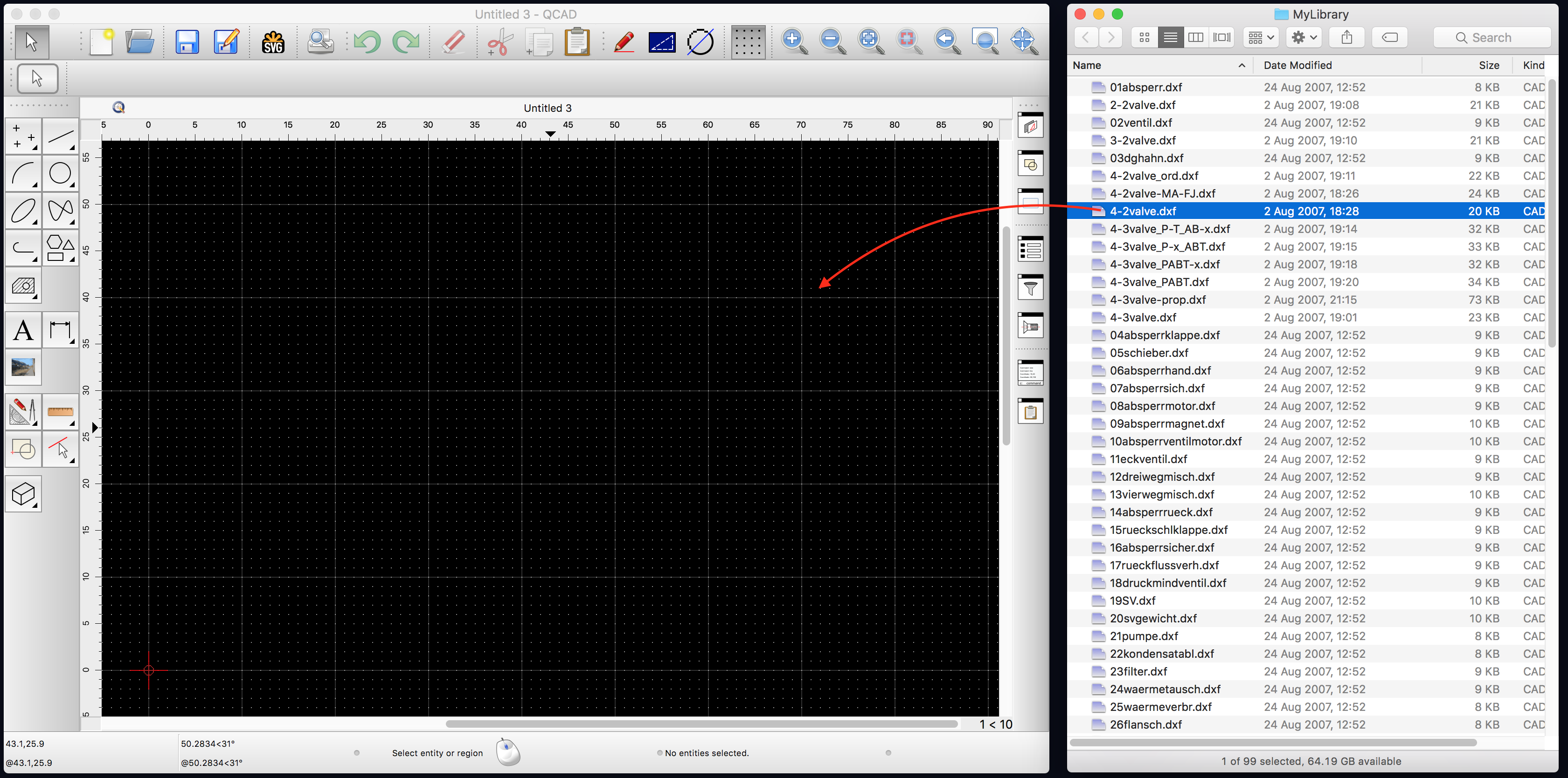 As an alternative to working with the QCAD Library Browser, you might find it more convenient to work with your favorite file browser instead. If you keep QCAD and any file browser open side-by-side, you can simply drag files over into your drawing area to insert them as blocks.