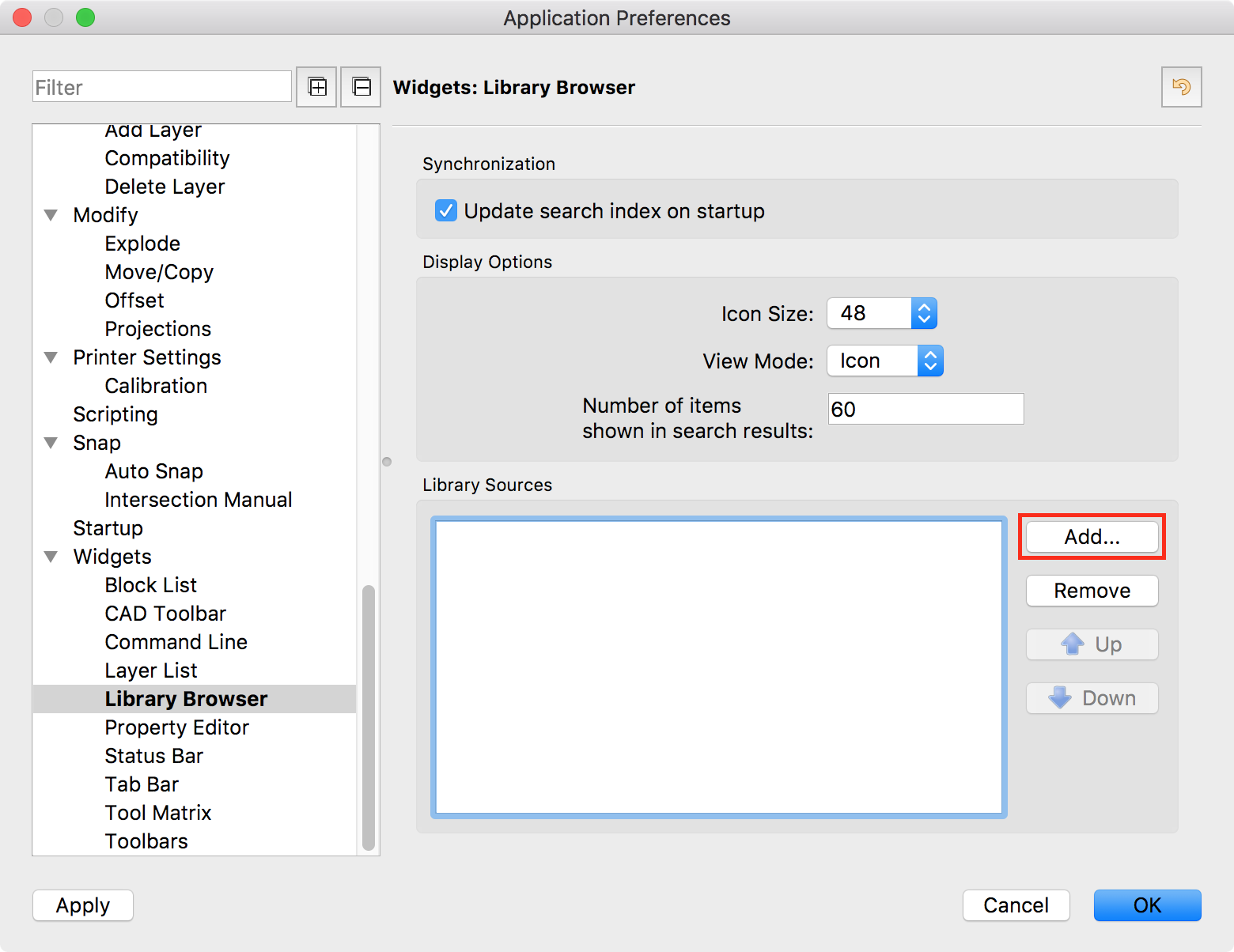 Edit > Application Preferences > Widgets > Library Browser > Library Sources > Add