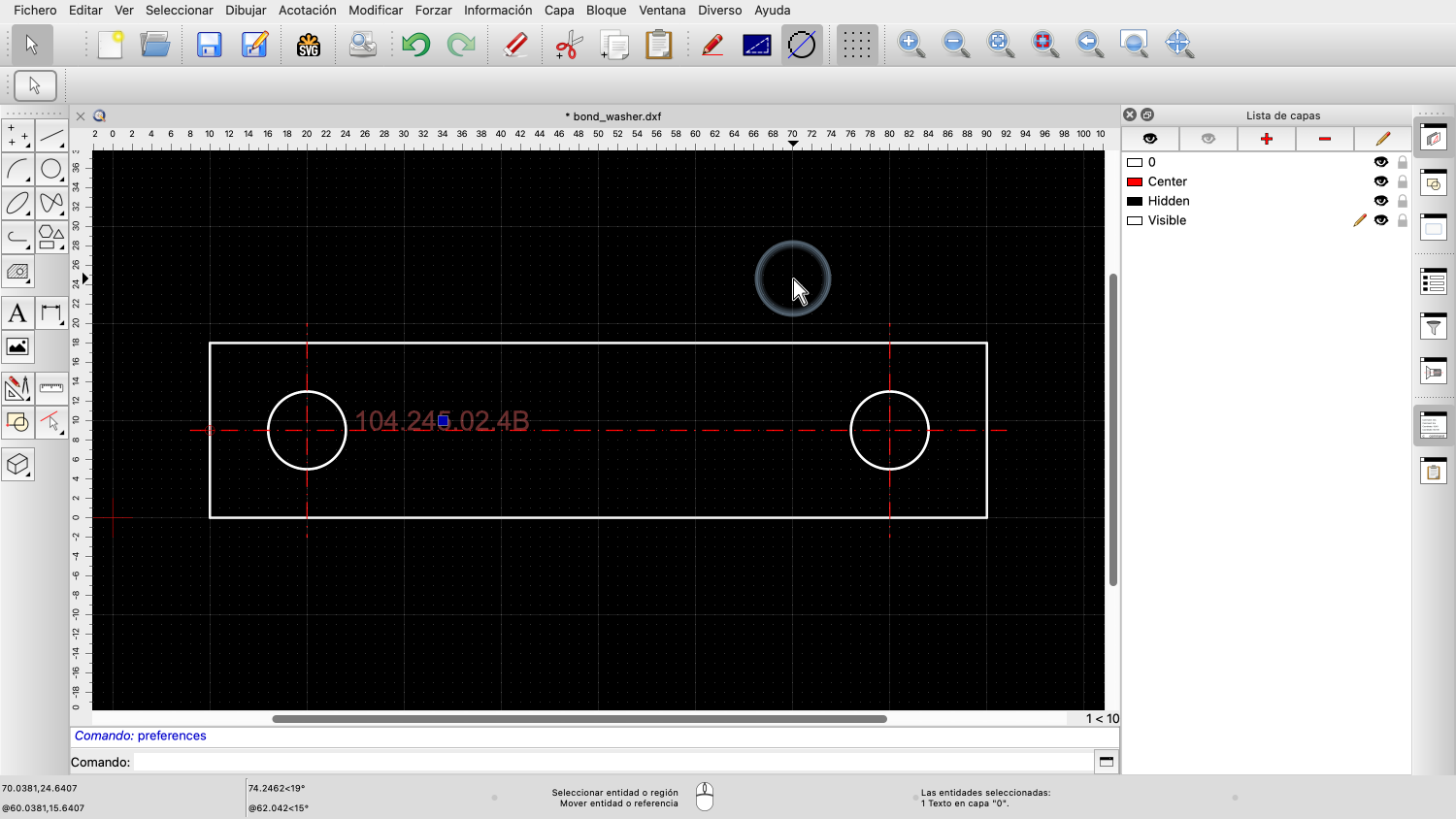 La línea central y los dos círculos están ahora en el portapapeles de QCAD.