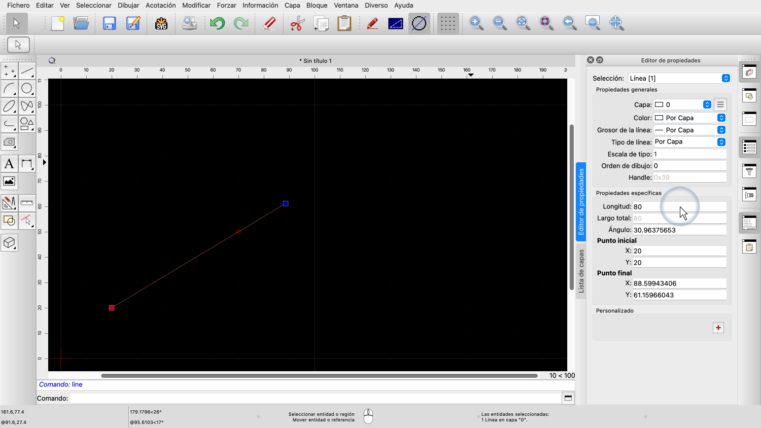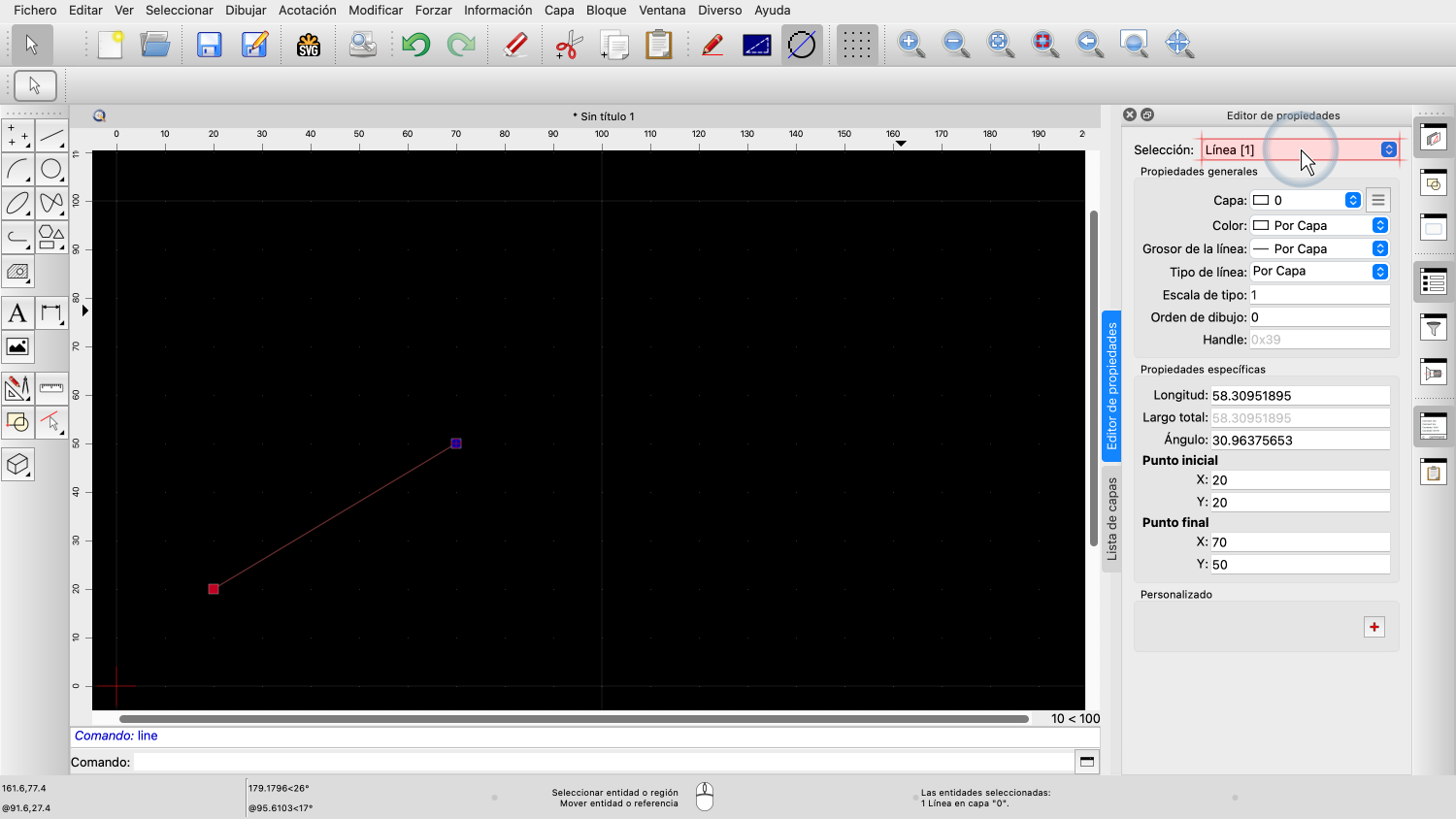 Para este ejemplo, dibujamos una línea y luego la seleccionamos, para poder ver sus propiedades.