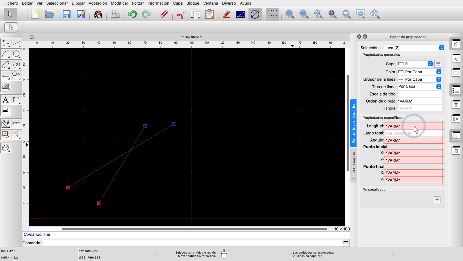 Otras propiedades son la longitud de la línea o su ángulo, así como las coordenadas del punto inicial y final.