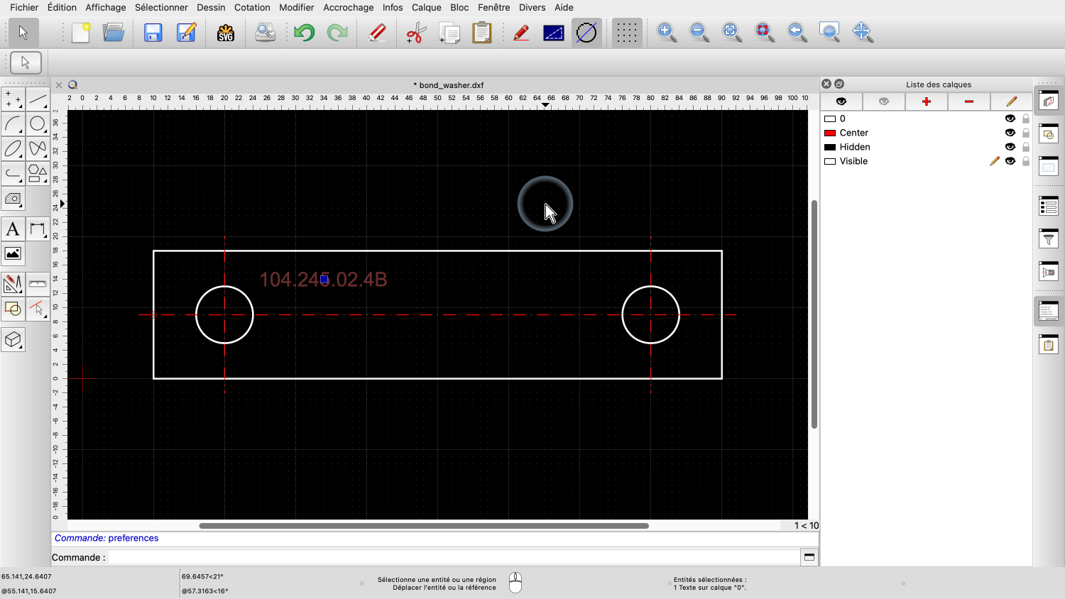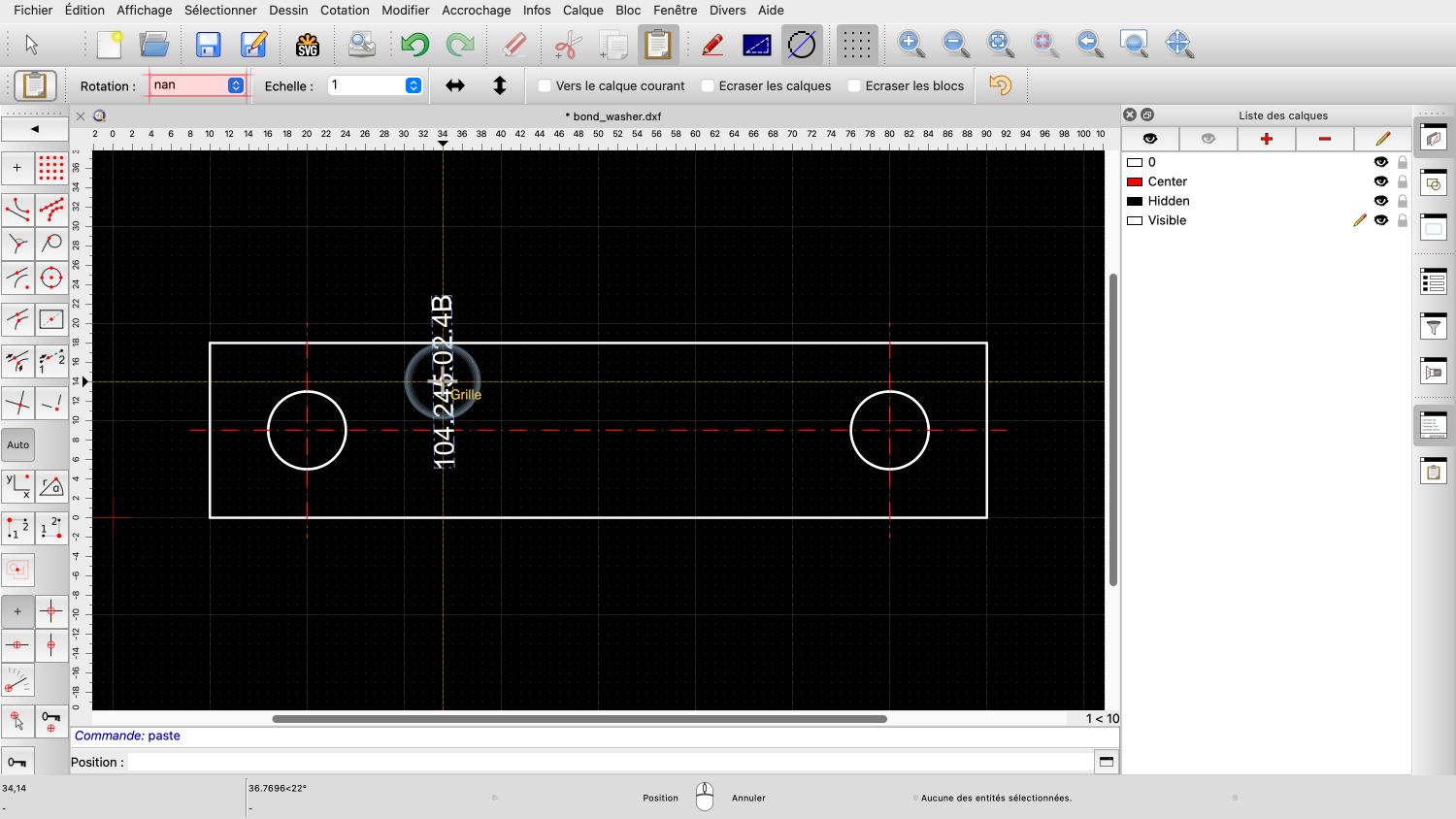 La ligne centrale et les deux cercles sont maintenant sur le presse-papiers QCAD.
