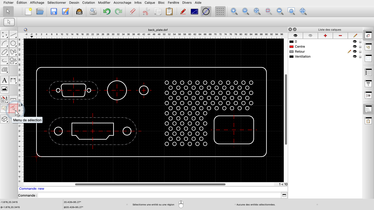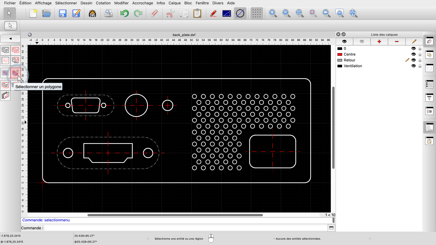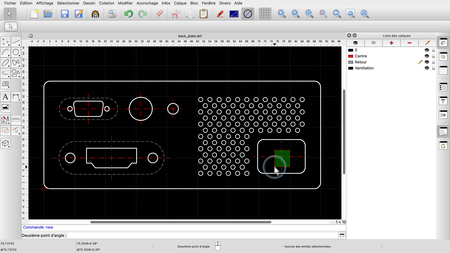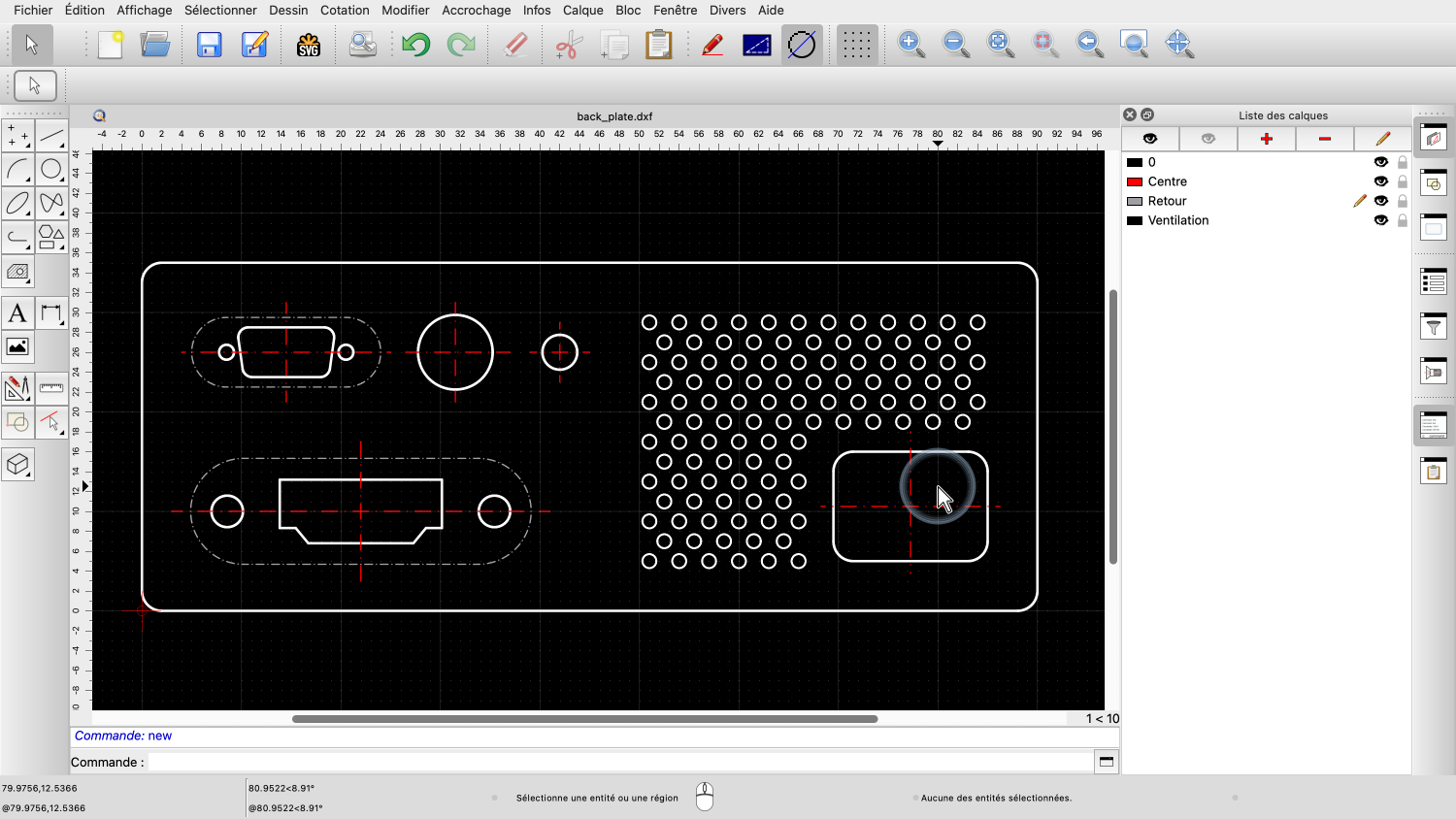 Pour démontrer les outils de sélection de base de QCAD, nous examinons cet exemple de dessin d'une plaque arrière pour un appareil électronique.