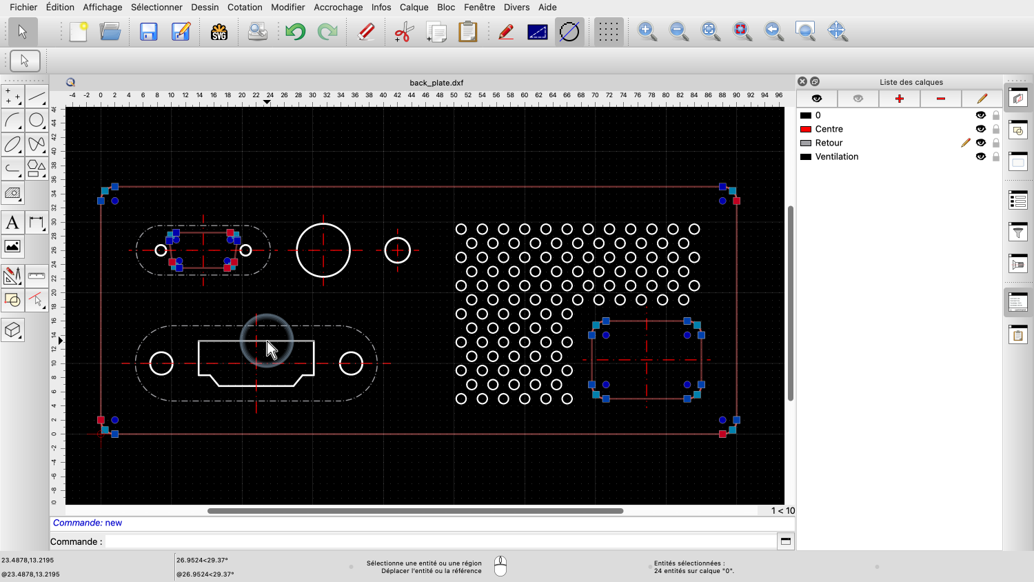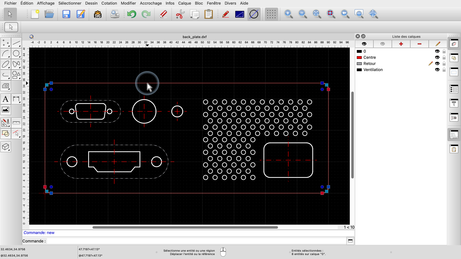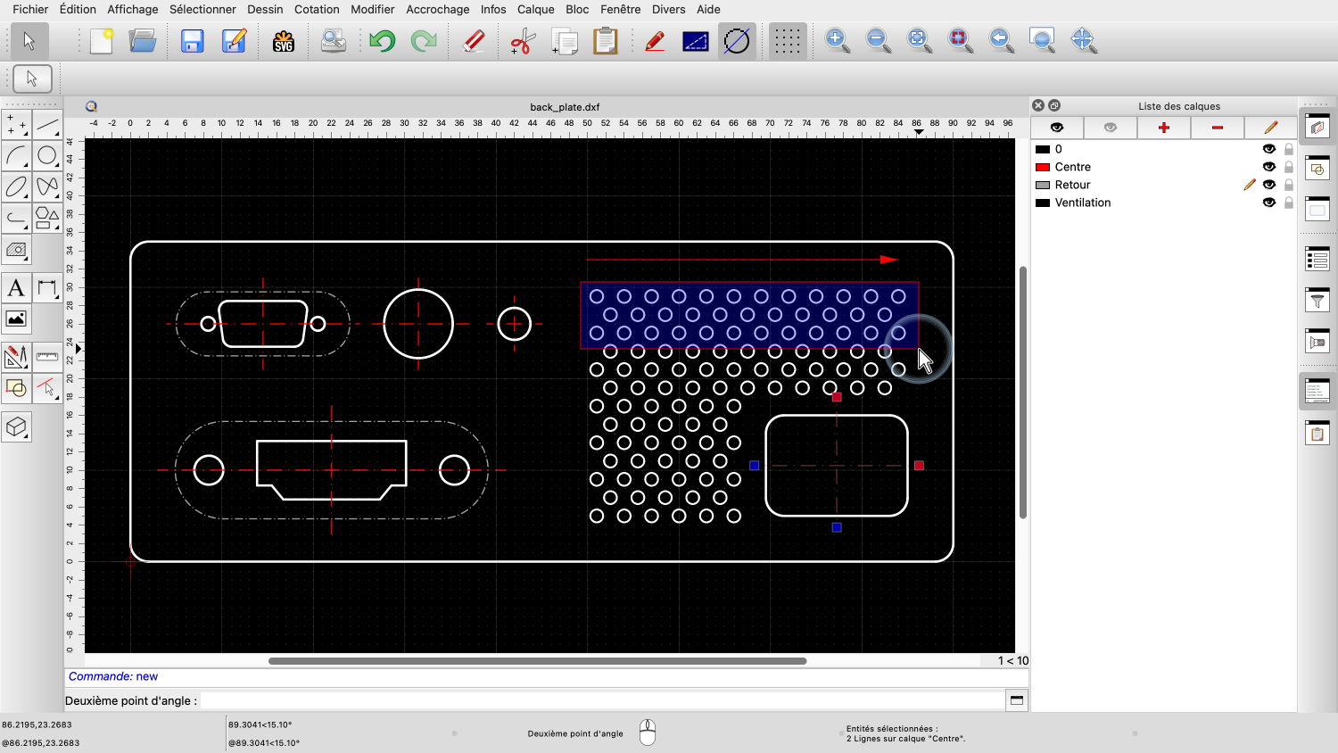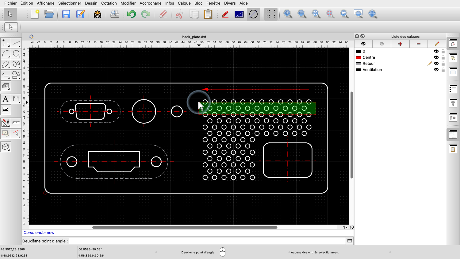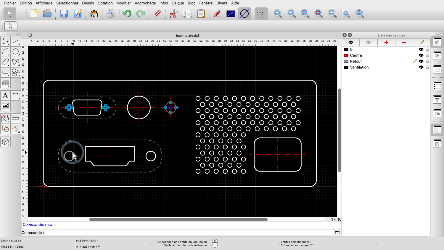 Pour démontrer les outils de sélection de base de QCAD, nous examinons cet exemple de dessin d'une plaque arrière pour un appareil électronique.