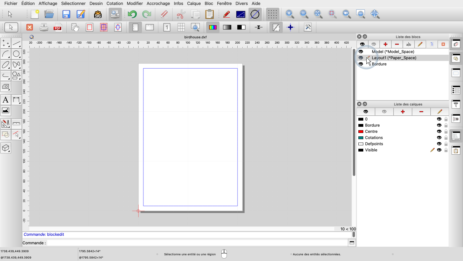 Selon notre version de QCAD, nous pouvons également voir les blocs de présentation du dessin en cours sous forme d'onglets sous la zone de dessin pour plus de commodité.