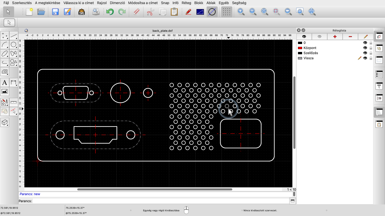 A QCAD alapvető kiválasztási eszközeinek bemutatásához nézzük meg ezt a példarajzot, amely egy elektronikai készülék hátlapját ábrázolja.