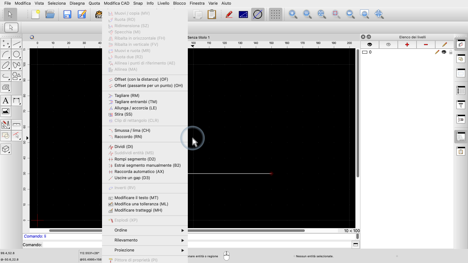 La maggior parte degli strumenti e delle funzioni di QCAD hanno uno scorciatoio di due lettere.
