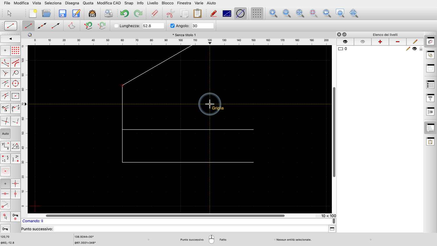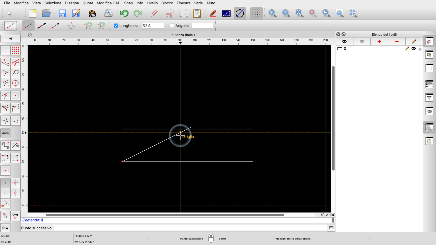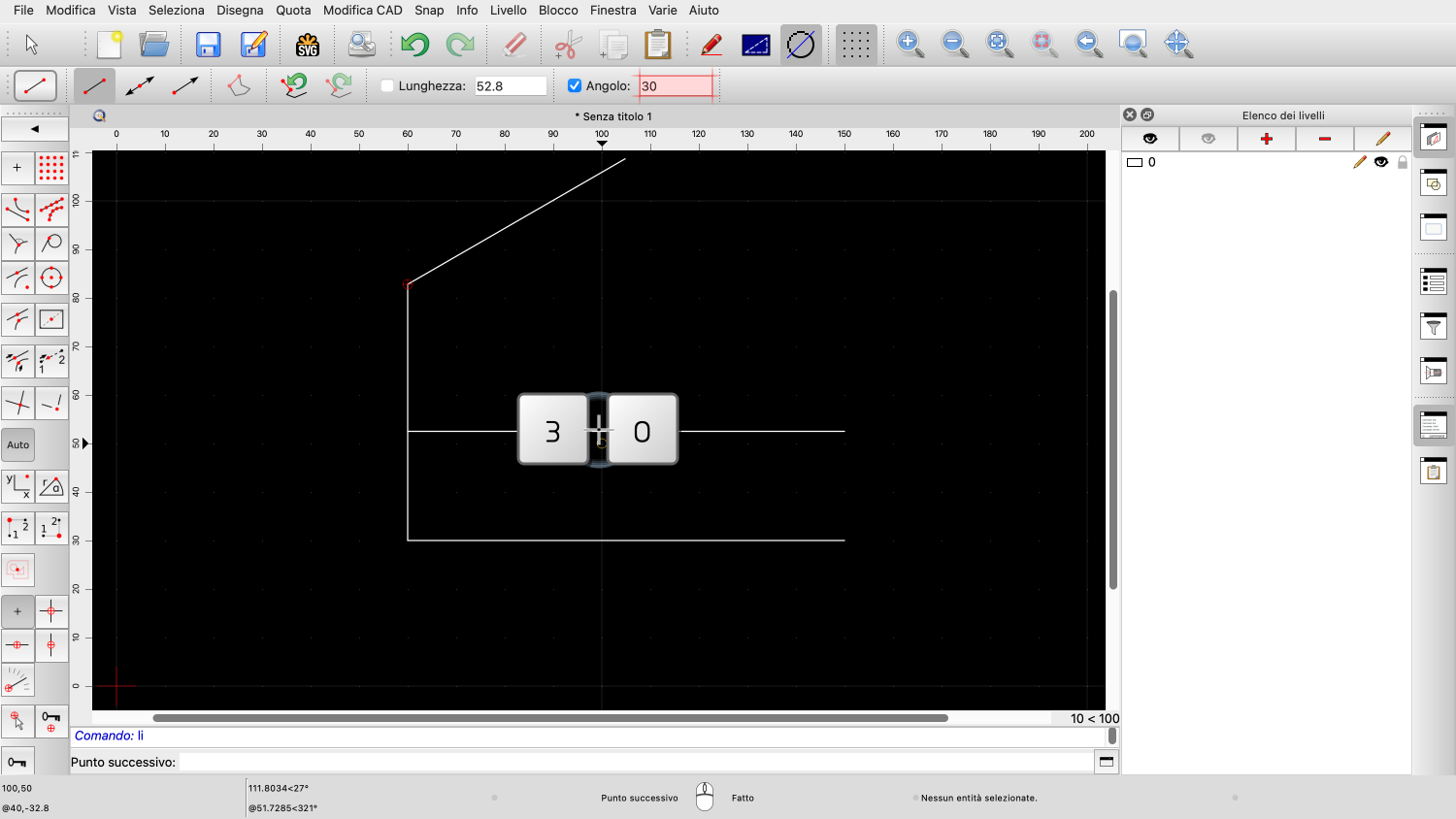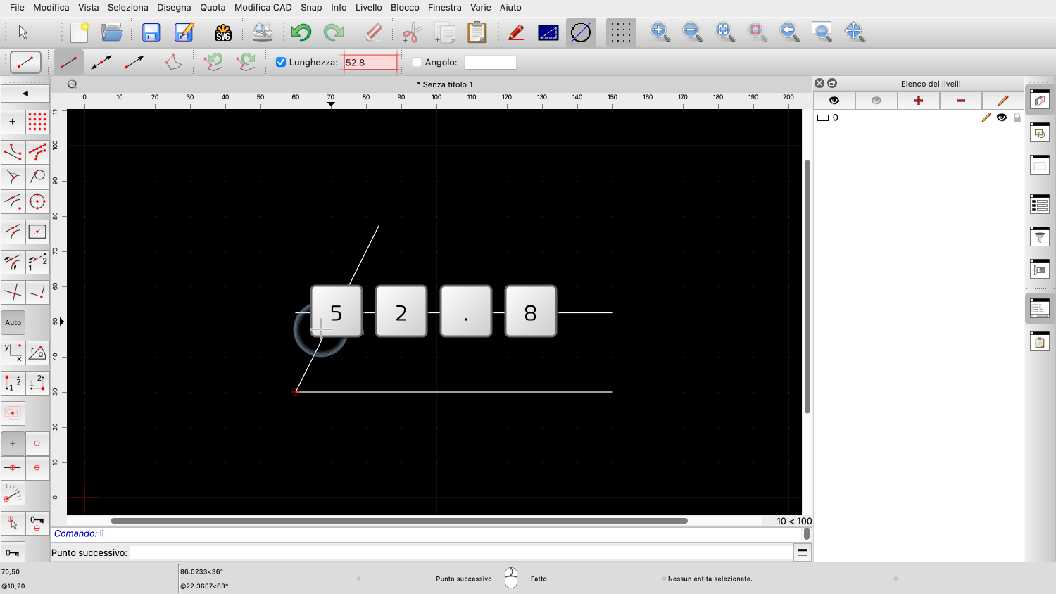 In questo esempio, vogliamo disegnare una linea di lunghezza pari a 52,8 unità di disegno.
