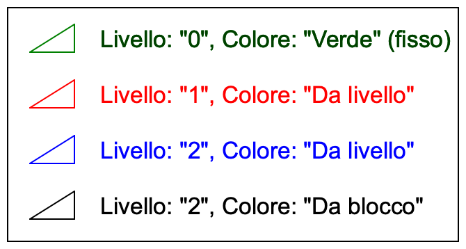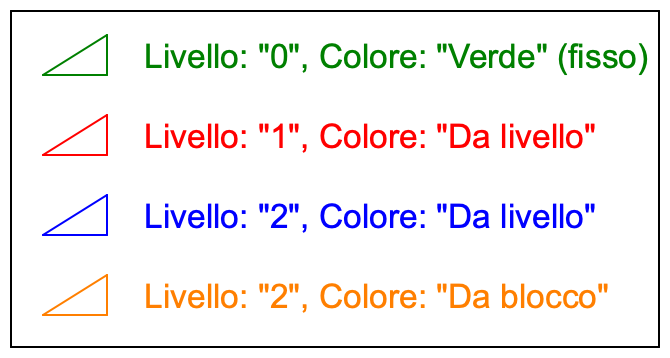 Questo significa che questo testo e triangolo saranno sempre mostrati in verde. Queste entità hanno un colore fisso. - Il secondo triangolo e testo si trovano sul livello "1" .