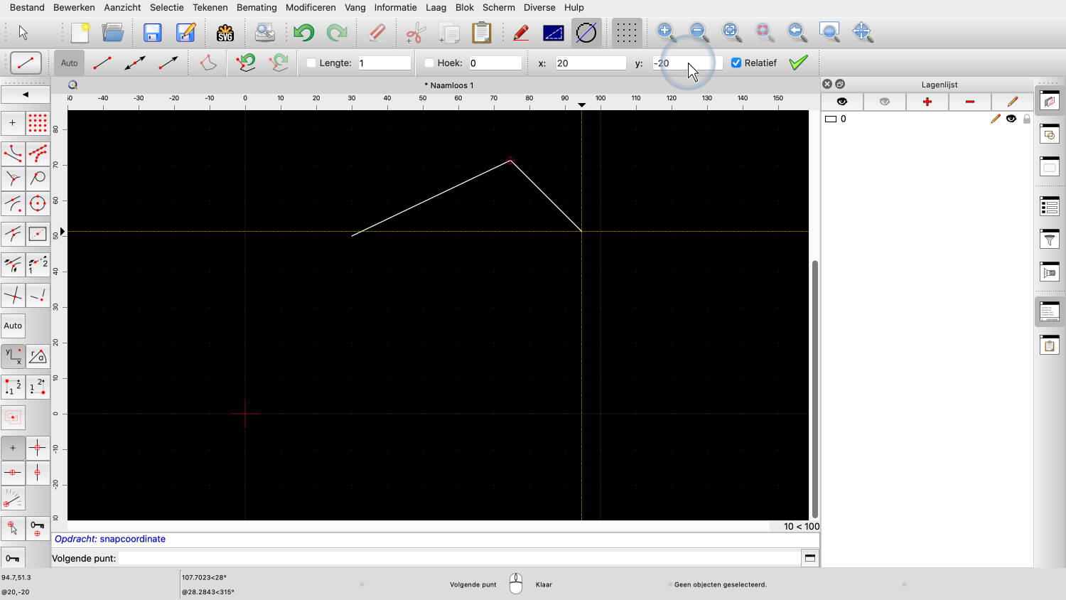 Door relatieve coördinaten in te voeren, kunnen we QCAD de gewenste afmetingen van onze lijn in [X] en [Y] richting aangeven.