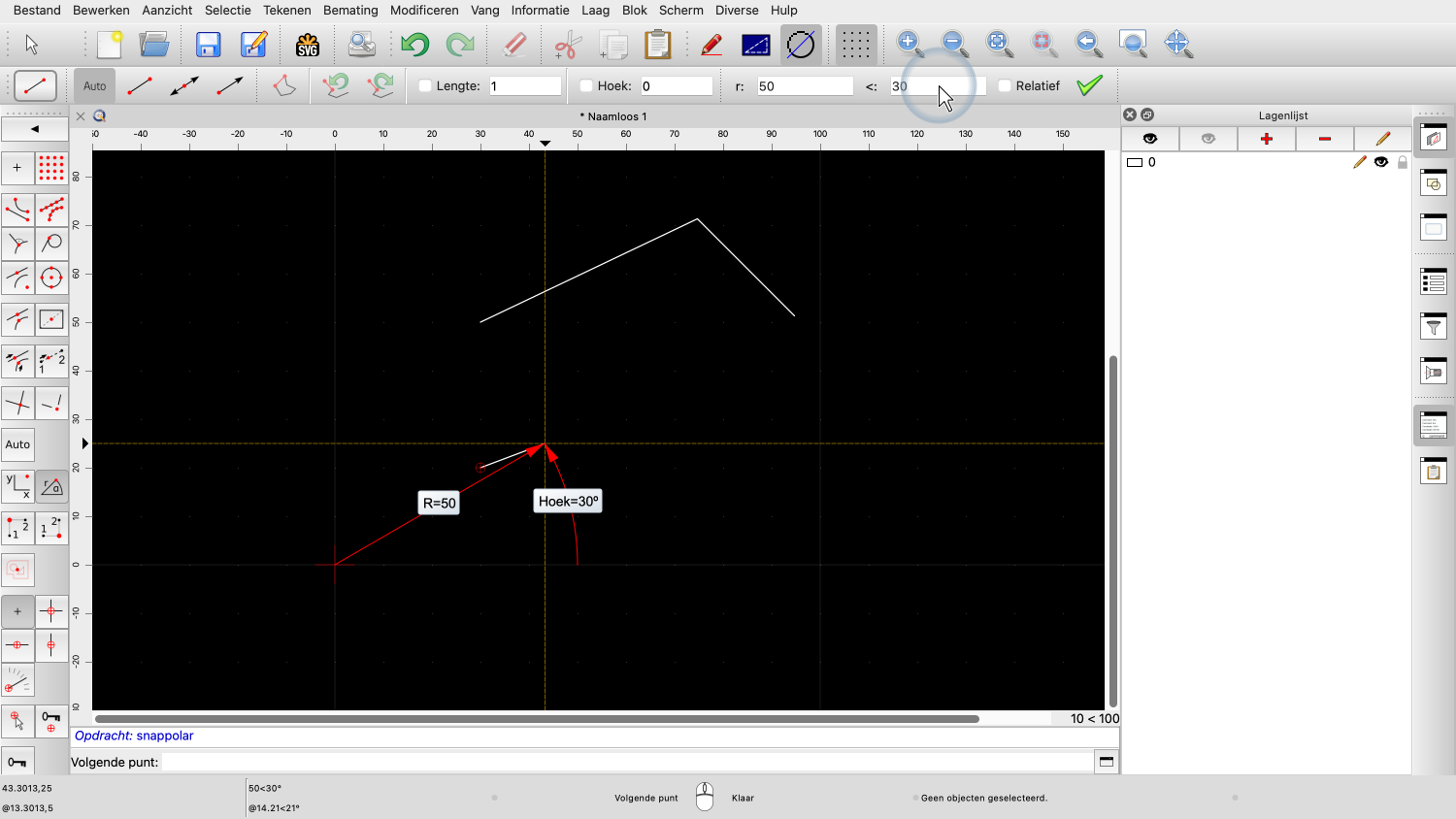 We voeren bijvoorbeeld een straal in van 50 en een hoek van 30 graden.