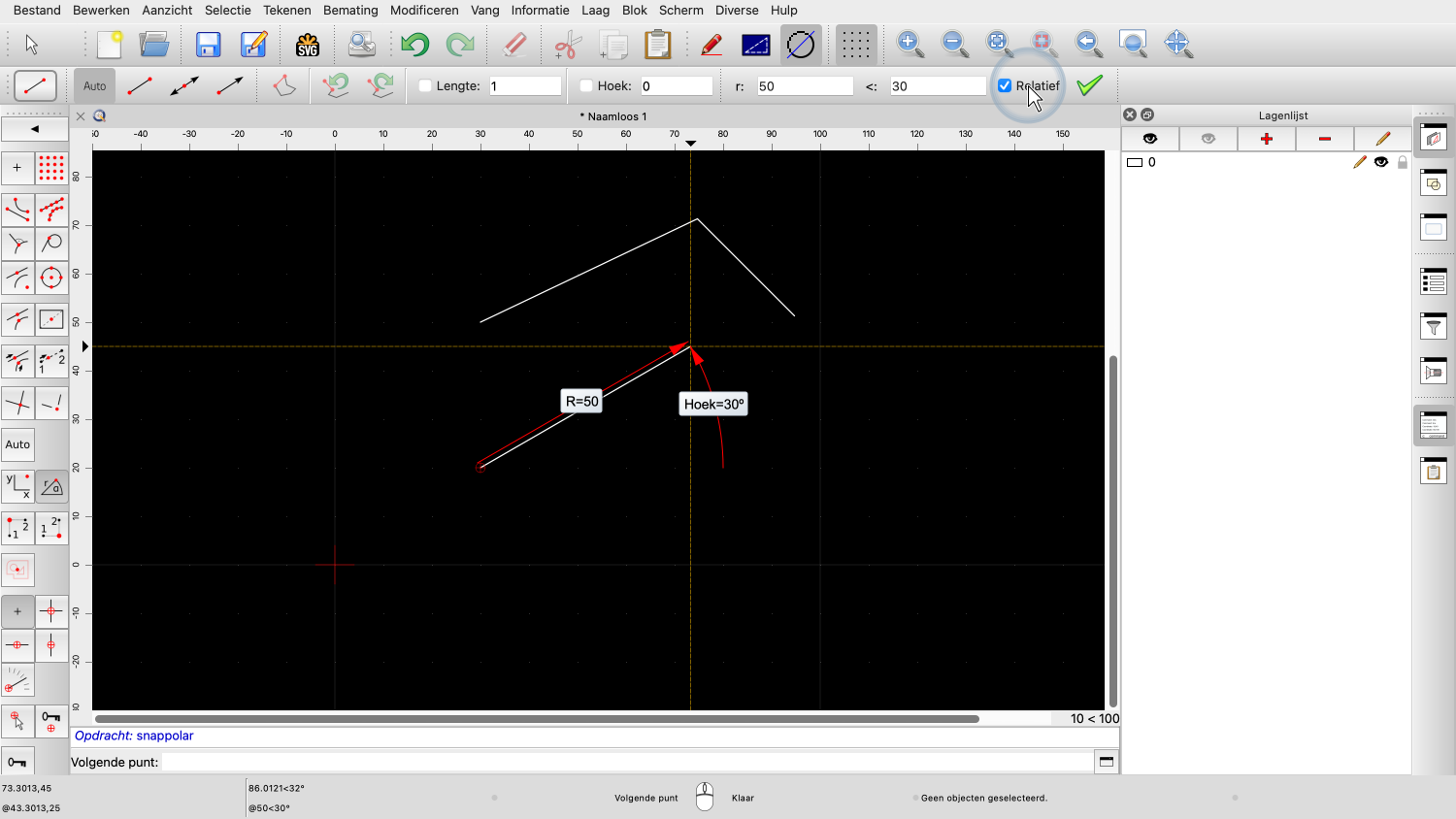 Als we ook relatieve coördinaten activeren, kunnen we een lijn tekenen die 50 eenheden lang is onder een hoek van 30 graden.